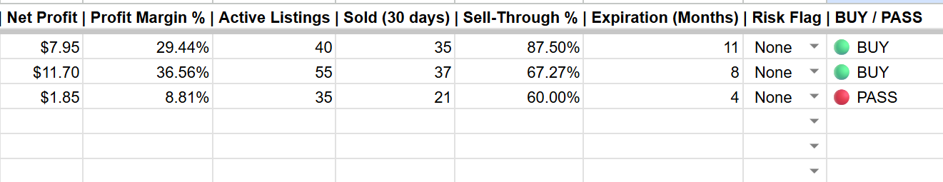 Stop guessing. This spreadsheet tells you BUY, CONDITIONAL, or PASS before you spend money on inventory.