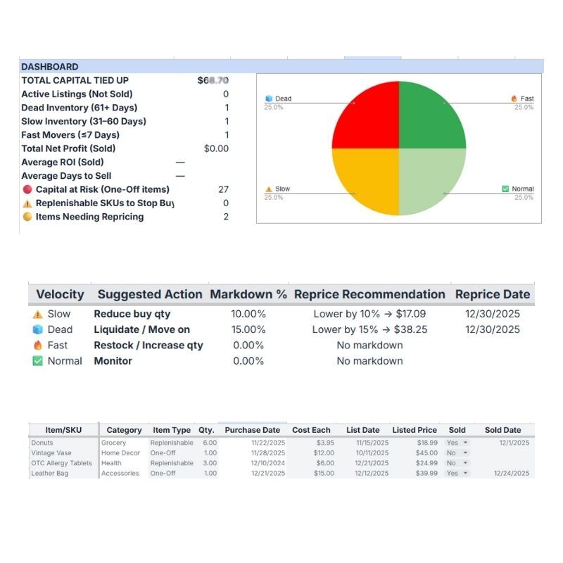Auto-calculated. Shows velocity, capital risk, ROI, and suggested actions.